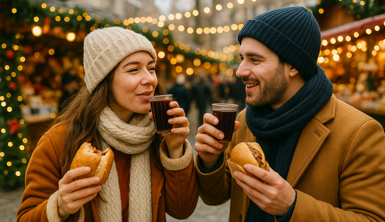 Pranzo ai mercatini. Prima di ripartire, decidono di mangiare qualcosa ai mercatini:panino caldo con salsiccia tirolese,patate speziate e un ultimo brindisi con vin brulé